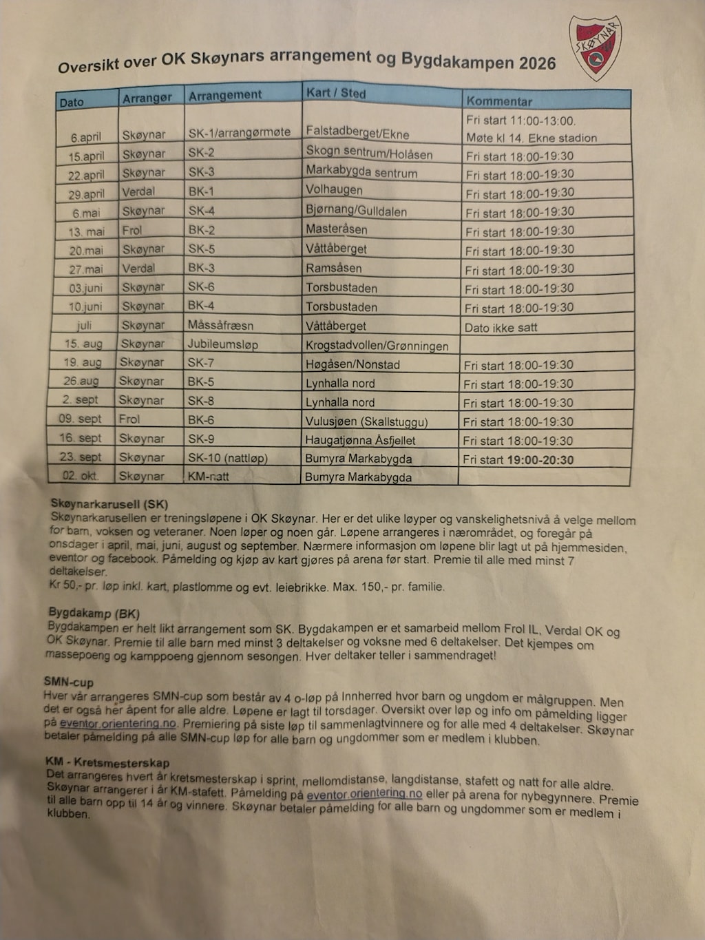 Oversikt over Ok skøynar arrangement og Bygdakamp